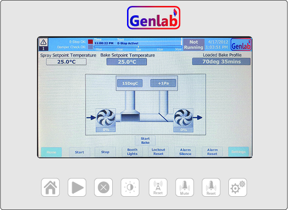 Our reliable control panels are tailored to the bespoke requirements for each installation. Using the latest touch screen PLC control, and developed over many successful projects, they provide accurate temperature and airflow control and can be upgraded to fully automated energy saving modes. Features include a pre-set time and temperature profiles for bake and spray modes, pressure monitoring and control and automated burner purge protection. the HMI screen provides a visual gauge showing booth pressure and temperature and damper position.